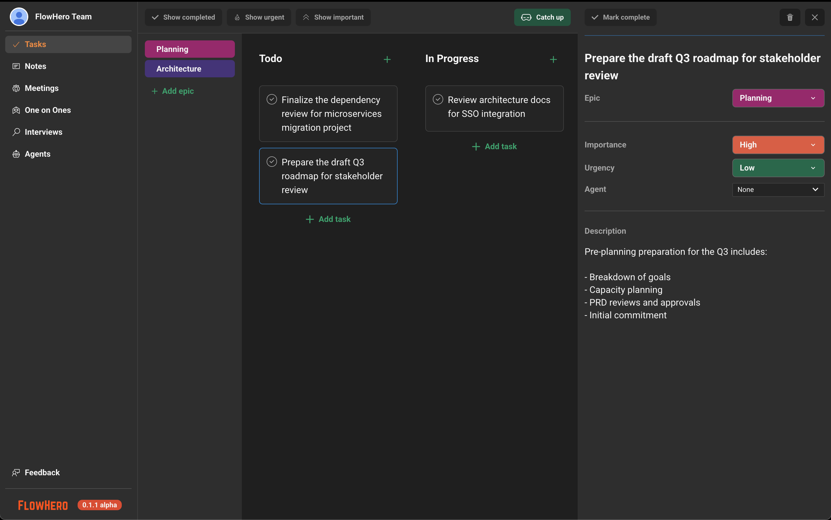 FlowHero brings your tasks, meetings, 1:1s, interviews, and AI agents into one focused workspace — so you can lead with clarity.